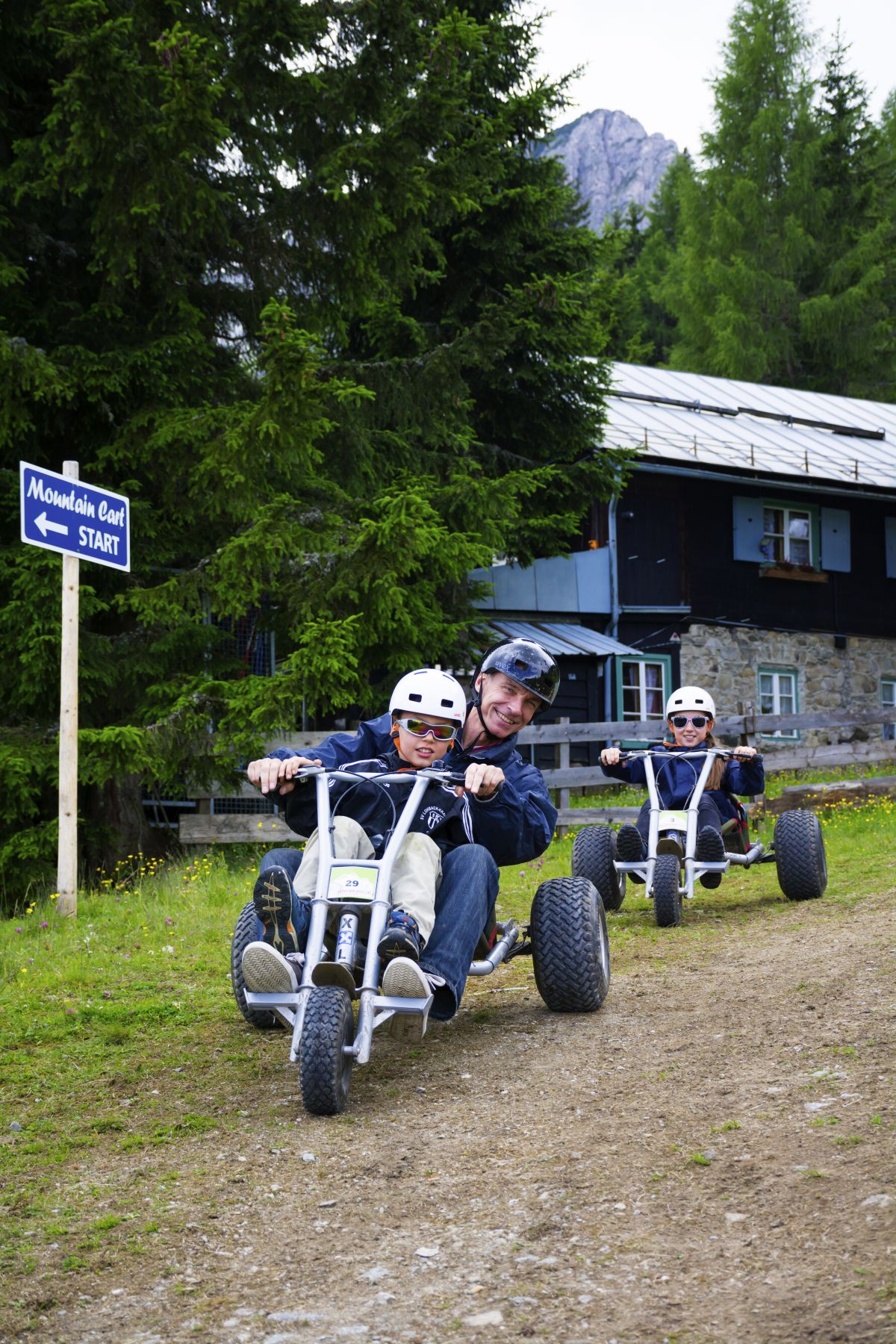 Ein besonderes Sommererlebnis ist das Mountain-Cart-Fahren: Auf einer eigenen, rund fünf Kilometer langen Strecke geht es auf drei Rädern rasant ins Tal – ein Spaß für Groß und Klein.